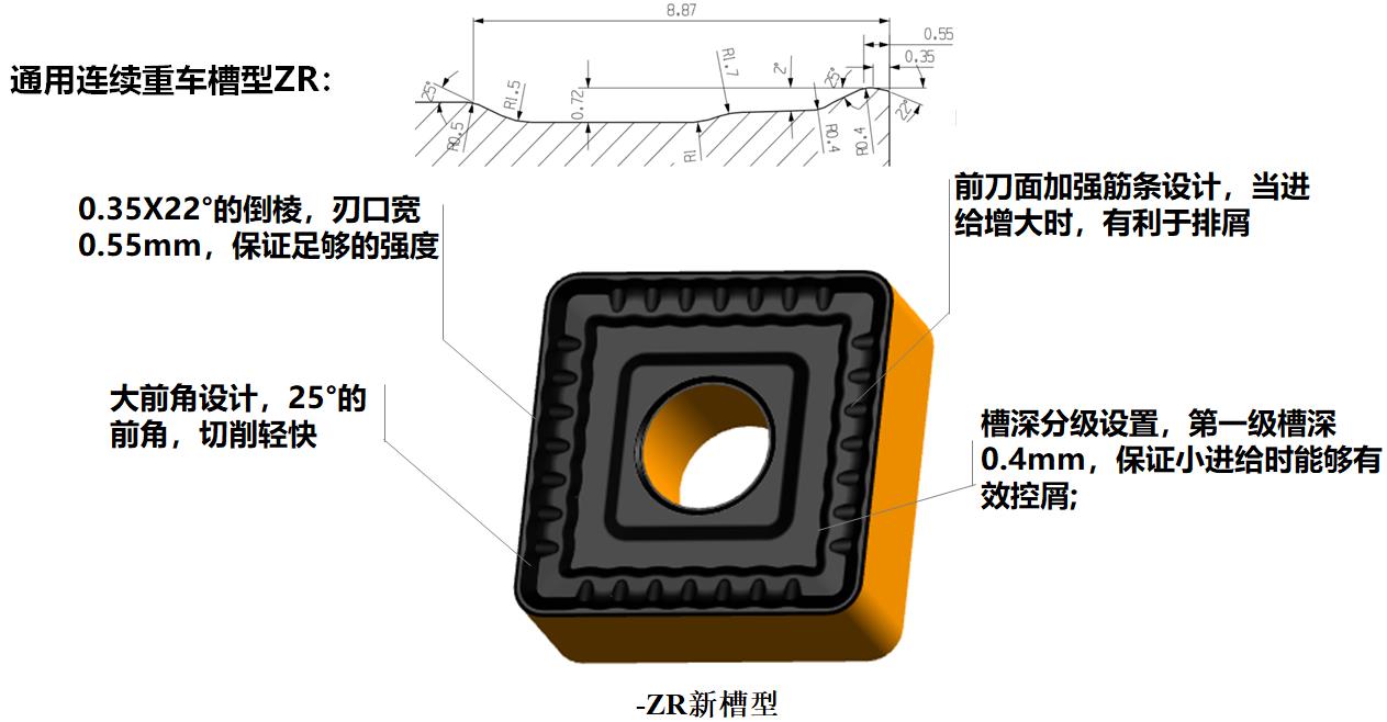 嶄新一代的CVD涂層刀片牌號(hào),采用了雙氧梯度過(guò)渡層技術(shù)、晶核預(yù)植涂層技術(shù)和基體微結(jié)構(gòu)精確控制技術(shù),卓著提升刀片刃線強(qiáng)度、抗磨損和高溫抗氧化綜合性能,雙色標(biāo)識(shí)層和超滑Al2O3涂層前刀面,與重力車削專用槽型匹配,全面提升重力車削刀片性能。