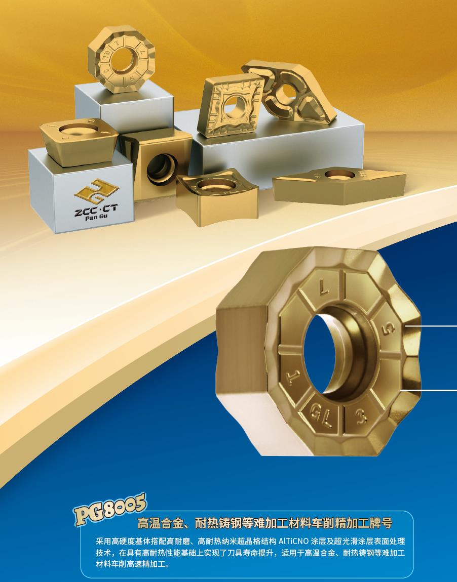 適合難加工材料高效加工的PG8系列數(shù)控刀片牌號(hào):PG8系列牌號(hào)采用高硬度基體搭配高耐磨、高耐熱納米超晶格結(jié)構(gòu)涂層以及超光滑涂層表面處理技術(shù),適用于高溫合金、耐熱鑄鋼等難加工材料。PG8005搭配NGF,SNR車削槽型分別用于難加工材料的高效車削精加工。PG8020、8030搭配FMA12、EMP09、FMP17等銑削刀具用于難加工材料的面銑、方肩銑以及仿型銑等加工。