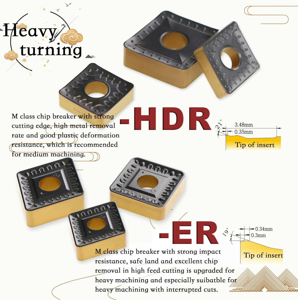 M-class chip breaker with strong impact resistance, safe land and excellent chip removal in high feed cutting is upgraded for heavy machining and especially suitable for heavy machining with interrupted cuts.