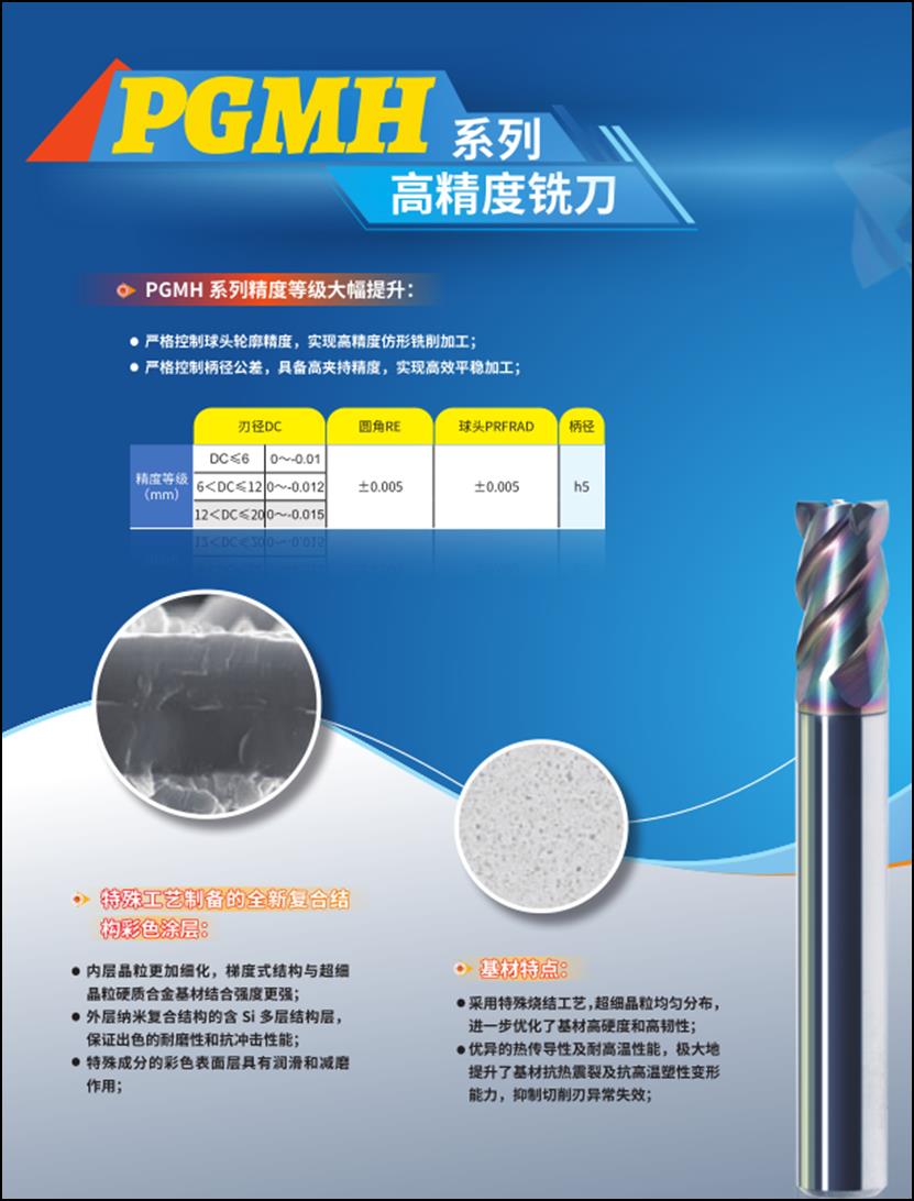適合高硬度高精度加工的PGMH整體硬質(zhì)合金銑刀:PGMH系列采用特殊燒結(jié)工藝,超細(xì)晶?;模哂懈玫臒醾鲗?dǎo)性和耐高溫性能,在高速高效加工過(guò)程中具備更好的抗熱震裂及抗高溫塑性變形性能;采用全新復(fù)合結(jié)構(gòu)彩色涂層,內(nèi)層的晶粒更細(xì),梯度式結(jié)構(gòu)與超細(xì)晶粒硬質(zhì)合金基體的結(jié)合強(qiáng)度高;外層采用納米復(fù)合結(jié)構(gòu)多層結(jié)構(gòu),保證了出色的耐磨性和抗沖擊性能;特殊彩色表面層,具有更好的潤(rùn)滑和減磨作用,辨識(shí)度高;在結(jié)構(gòu)方面采用大芯厚高剛性設(shè)計(jì),保證在大參數(shù)切削環(huán)境下加工過(guò)程的平穩(wěn)。